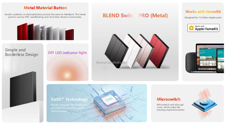 Công tắc sử dụng nhôm kim loại và quá trình oxy hóa anốt giống như MacBook. Bảng kim loại được đúc bằng CNC, phun cát và hơn hàng chục quy trình. Người dùng có thể tùy chỉnh màu sắc và hiệu ứng ánh sáng của đèn LED để chỉ ra các trạng thái khác nhau của công tắc. Với đèn báo LED, chúng ta có thể tìm và vận hành công tắc ngay lần đầu tiên trong môi trường tối. Được che chắn bởi kim loại. Nó sử dụng hợp kim kẽm chất lượng cao cấp