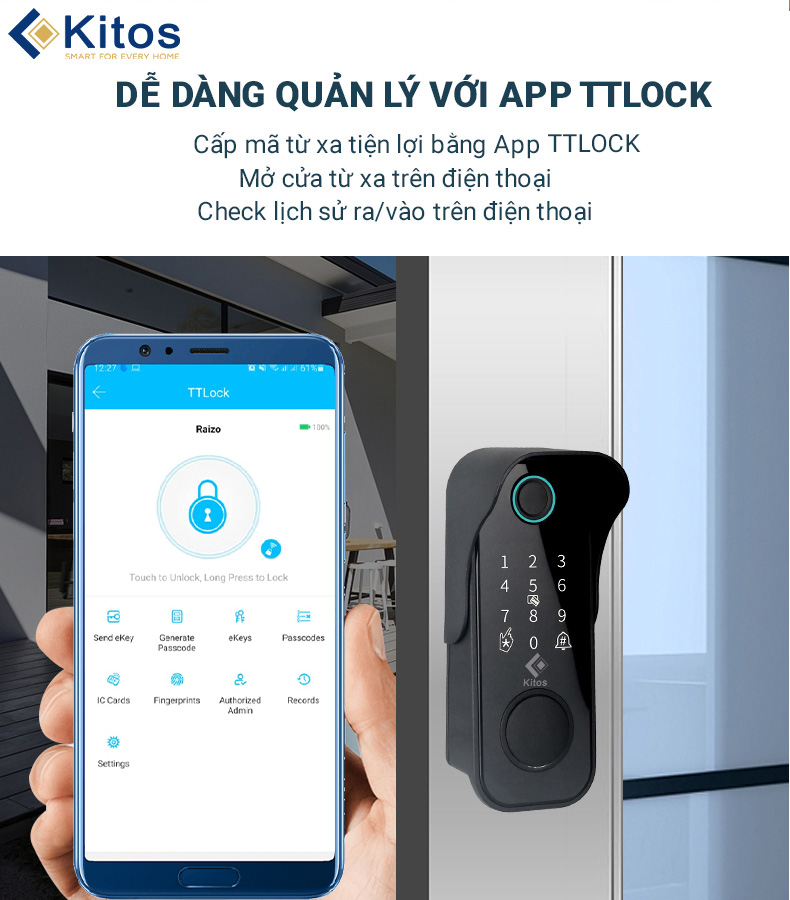 - Chức năng : Vân tay , thẻ từ , Chìa cơ, App bluetooth ( Ttlock )